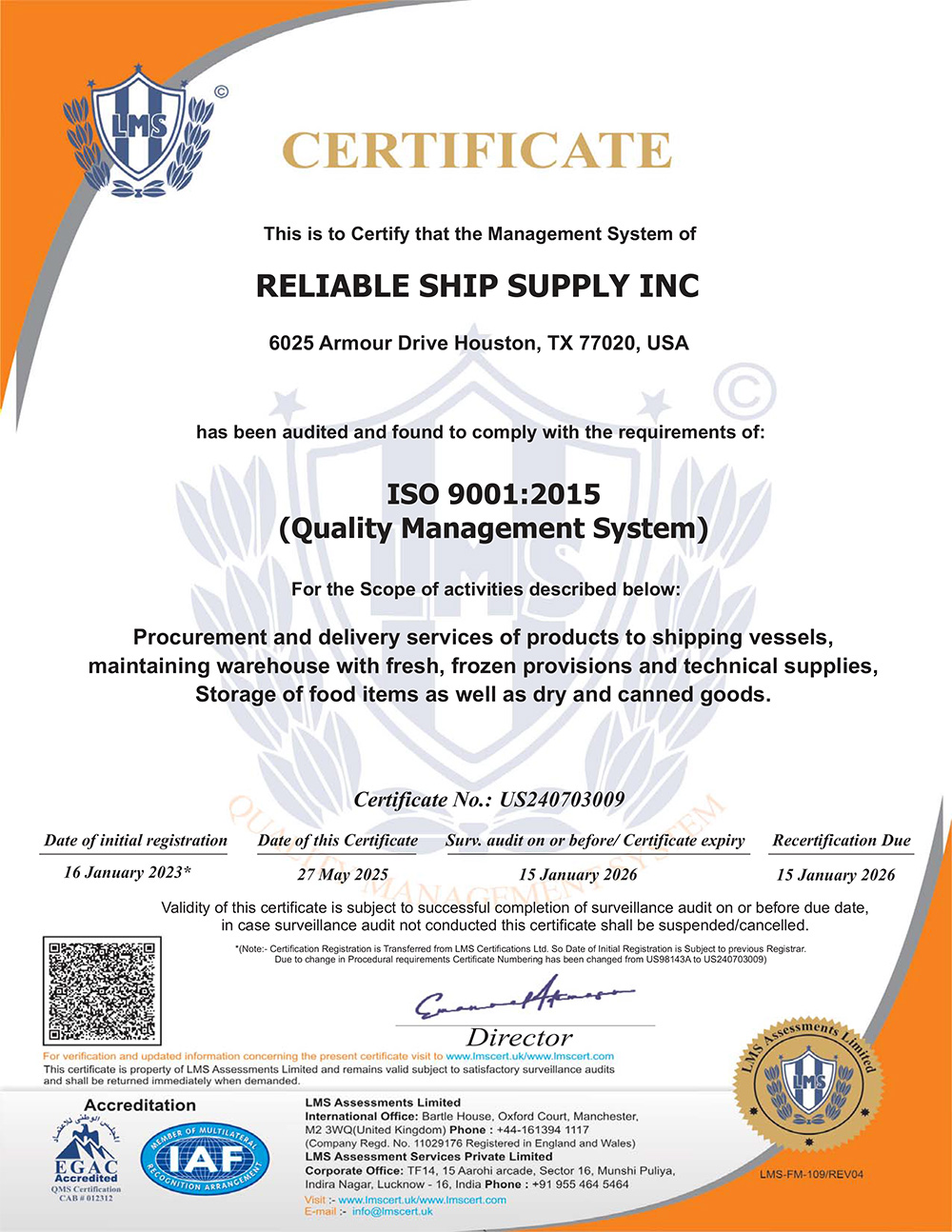 Reliable Ship Supply Inc is IMPA and ISSA member with ISO 9001:2015 (Quality Management System), ISO 22000:2018 (Food Safety management), ISO 14001:2015 (Environment management system), Hazard Analysis & Critical Control Point (HACCP) certified, reflecting our commitment to quality of service and management. Our rigorous processes and attention to detail set us apart in the industry.